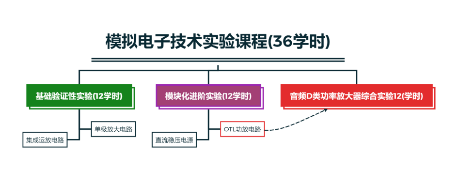 本实验课程采用三阶递进式教学设计,第一阶段是基础验证性实验(单级放大电路、集成运放电路)、第二阶段是模块化进阶实验(OTL功放电路、直流稳压电源),最后一个阶段是本实验项目D类功率放大器的设计。