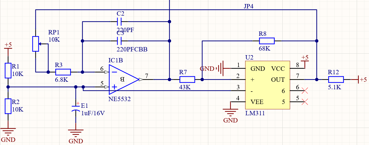 三角波发生电路采用双运放高性能低噪声运算放大器NE5532和高速精密电压比较器LM311来实现。NE5532具有较宽的频带和转换速率(摆率),能够保证产生线性良好的三角波。载波频率的选定既要考虑抽样定理,又要考虑电路实现,本实验选择约150kHz的载波。