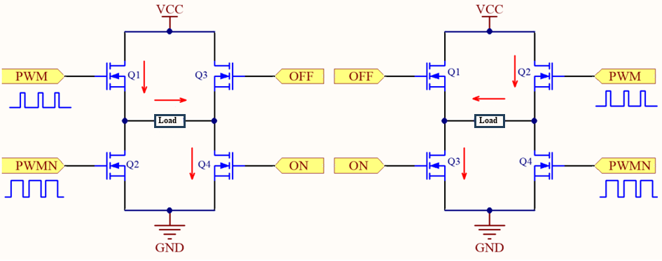 D类功放的功率放大级通常采用 H桥拓扑(Full-Bridge),由四组功率开关器件构成,通过互补开关将PWM信号转换为高功率电流脉冲。图8是H桥电路结构原理图,PWM和PWMN是互补的PWM信号。在PWM为高电平时:MOS管1和4都导通,MOS管2和3都截止,电流从电源正极,经过MOS管1,从左到右流过负载、然后经过MOS管4流入电源负极。在PWM为低电平时:MOS管2和3都导通,MOS管1和4都截止,电流从电源正极经过MOS管2和MOS管3形成电流回路。