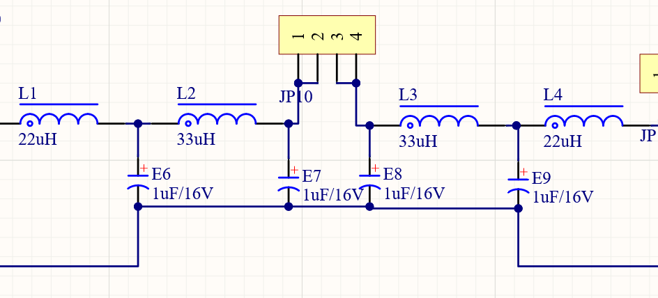 低通滤波电路是D类功放的关键模块,负责将功率放大输出的PWM方波信号还原为平滑的模拟音频信号,同时抑制高频开关噪声(载波频率及其谐波)。其设计直接影响输出信号的保真度、频响特性及电磁兼容性(EMI)。典型设计滤波器采用二阶LC低通滤波器,由电感L和电容C构成。但是为了保证音频信号的高保真输出,本次设计采用四阶Butterworth低通滤波。