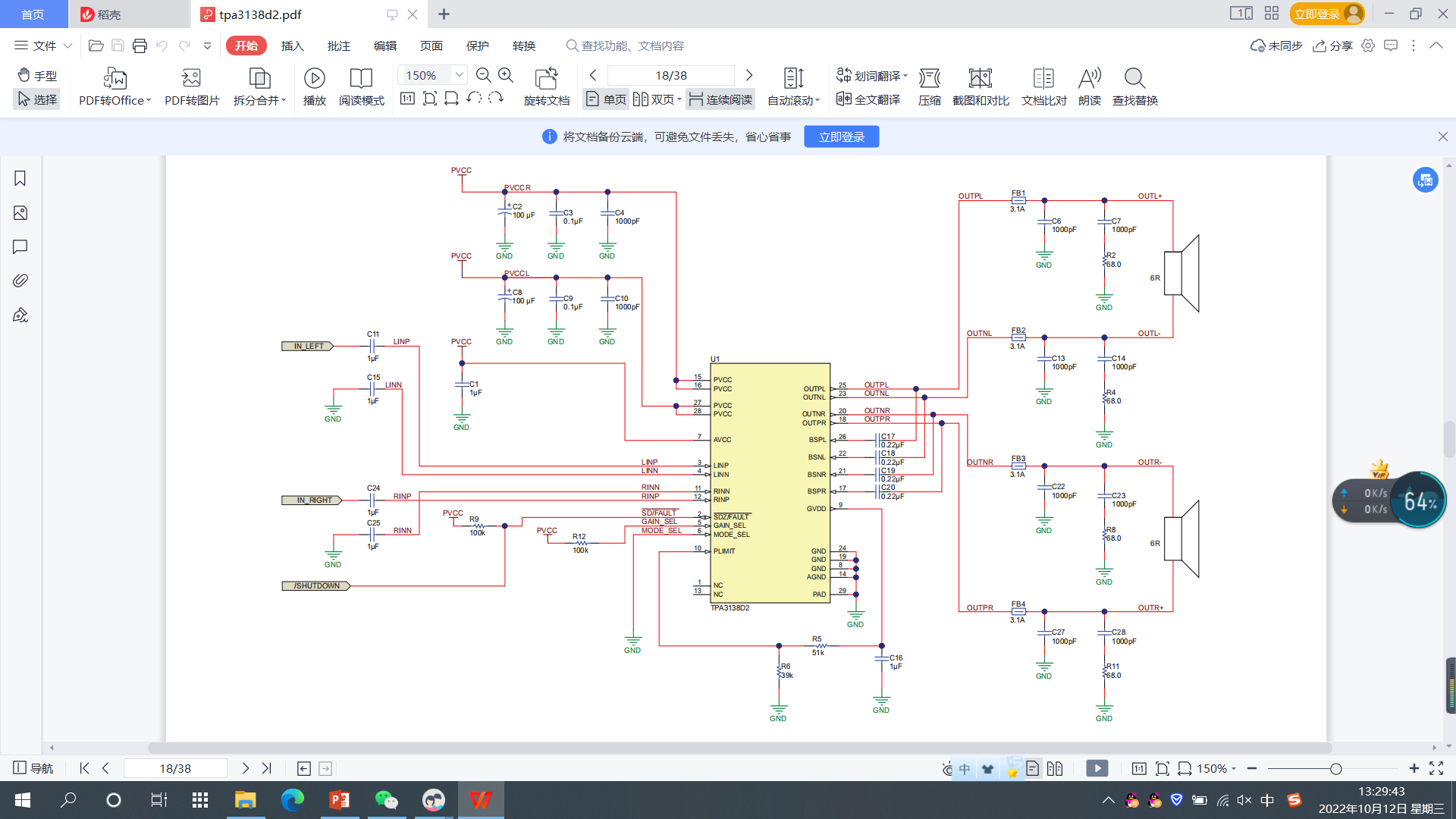TPA3138D2立体声D类扬声器放大器是一款10W/通道、高效、低空闲电流D类立体声音频放大器。该放大器可驱动立体声扬声器,负载低至3.2Ω。在1SPW模式下,它的空闲电流很低,仅为21mA (12V),运行电压低至3.5V。因此,在蓝牙扬声器、电池供电设备和其他功耗敏感型应用中可长时间播放音频,提高热性能。采用扩展频谱控制的高级EMI抑制既能实现使用成本较低的铁氧体磁珠滤波器,同时又能满足EMC要求,降低了系统成本。