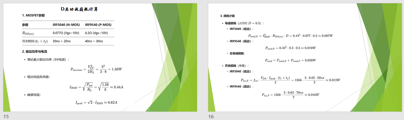 运算放大器应用(前置放大、积分器设计)、PWM调制(三角波发生器、滞回比较器)、功率开关电路(MOSFET开关特性、H桥死区控制、效率优化)、四阶LC低通滤波器。