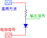 图7给出了利用二极管实现一路方波信号控制另一路方波信号输出的开关功能,其中二极管的正负极分别输入高频方波和音调信号。该电路的输入和输出关系可以分析如下。当电报音调信号为高电平时,二极管不导通,电路没有电流,输出信号与高频方波相同;当电报信号为低电平、且高频信号为高电平时,二极管导通,输出节点的电压钳制为二极管导通电压。此电压一般较小,通常硅管为0.7V,锗管为0.3V,因此输出为低电平。