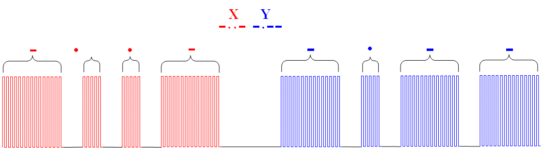 点和划的区别在于信号持续的时间长度不同。莫尔斯电码包括五种时间长度:短促的点信号、保持一定时间的划信号、点和划之间的快速停顿、字母之间中速停顿、以及单词之间慢速停顿。在国际莫尔斯电码中,一个点信号的长度为1个单位时间长度(通常为50ms),一个划信号的长度为3个单位时间长度,一个字母中点划间隔的长度为1个单位时间长度,两个字母间隔长度为3个单位时间长度,两个单词间隔长度为7个单位时间长度。