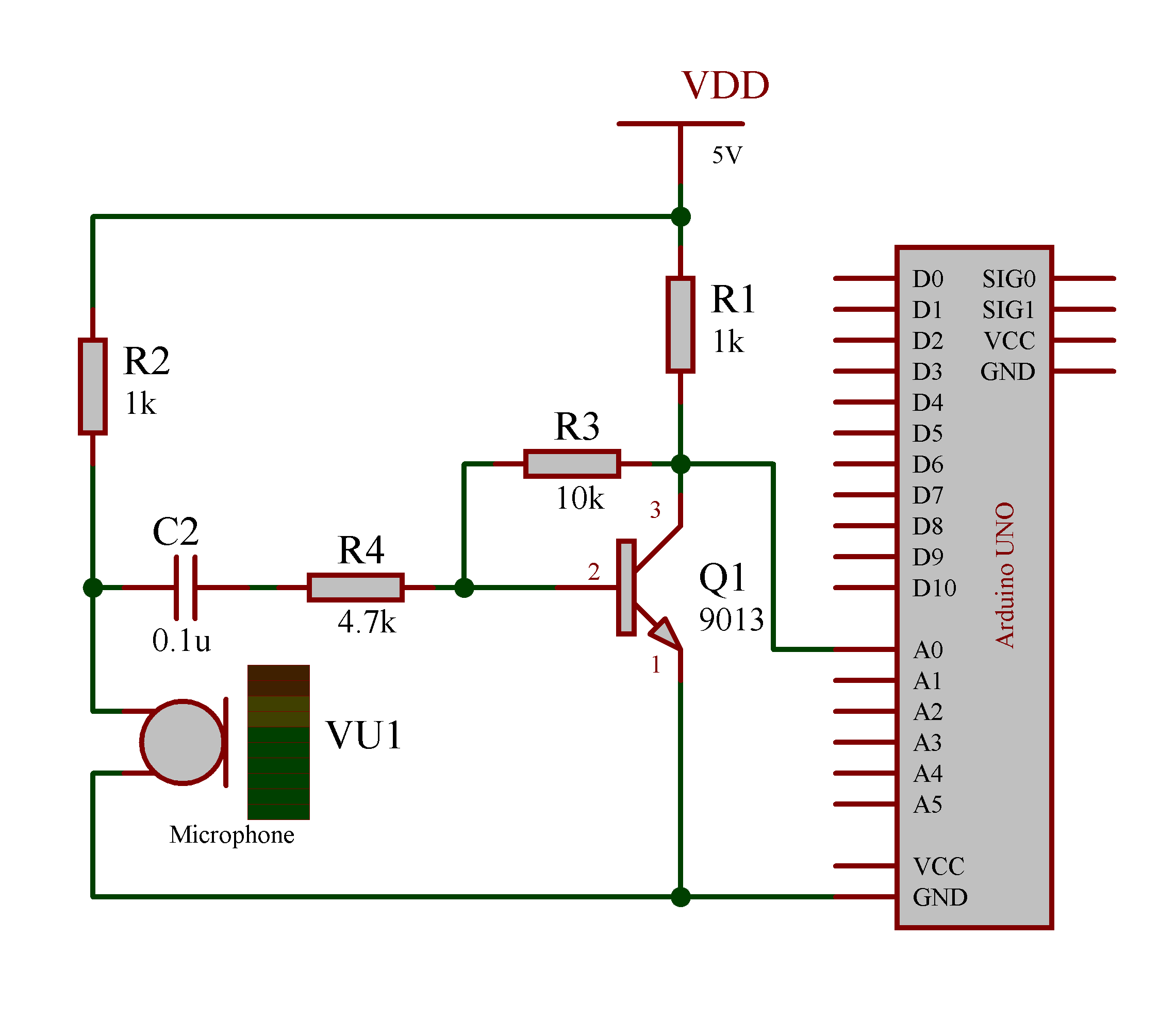 **信息获取模块:**功能是将麦克风信号输入至Arduino的模拟输入端口。此模块的核心是基于三极管的小信号放大电路,这在本课程前期基础实验中完成的“声控LED”实验中已学习过。图10给出了实验中使用的小信号放大电路,其中电阻R2为驻极体麦克风供电,电阻R1与R3为三极管提供偏置电压,以设置合适的静态工作点,电阻R4可控制放大器失真,电容C2将输入的麦克风信号耦合至放大电路,最后放大后的声音信号输入至Arduino的模拟输入端口A0,进行后续的信息处理。