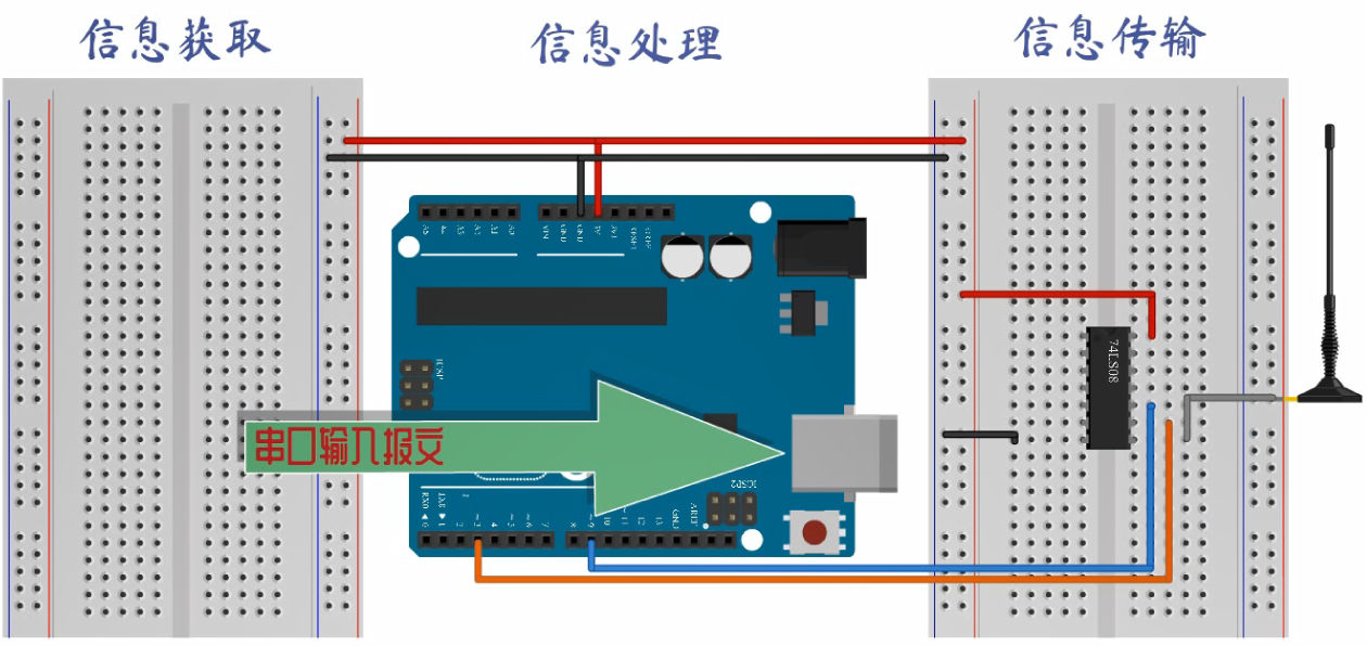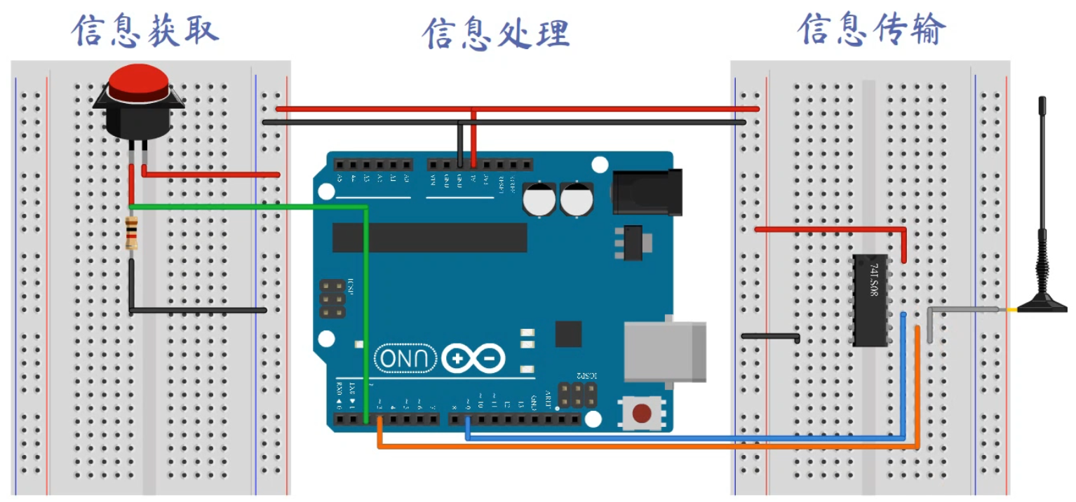 **基本要求:**实现无线电报的按键发报功能,具体分为信息获取、信息处理、信息传输三个模块。信息获取模块采用按键电路向Arduino输入高低电平。信息处理模块采用Arduino编程,根据获取的输入电平生成需要发送的音调信号。信息传输模块利用Arduino输出的高频方波信号来携带音调信号,实现无线信号发射。使用蜂鸣器测试音调信号和发射信号,使用收音机接收无线电报信号,完成实验测试。