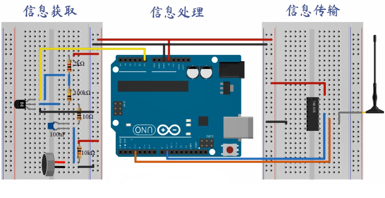 **拓展要求:**实现无线广播功能。信息获取模块采用麦克风信号放大电路,将声音信号输入Arduino模拟端口;信息处理模块采用Arduino模拟输入和模拟输出功能,将麦克风声音信号转为PWM信号;信息传输模块保持不变。