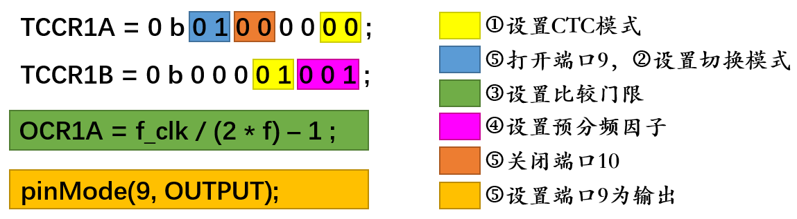 定时器/计数器有多种工作模式,为了生成高频方波,需要进行五项设置: