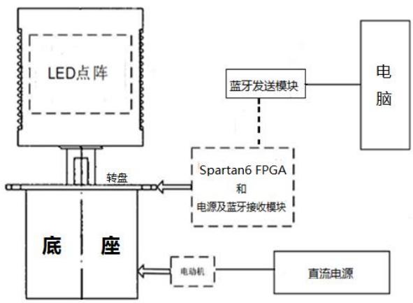 本实验的方案设计框图如图2所示。系统底座支架上安装电机,直流电源给电机供电。转盘固定在电机上,它上面有LED面板、PFGA开发板、充电电源、蓝牙接收模块。电脑上有蓝牙发送模块。