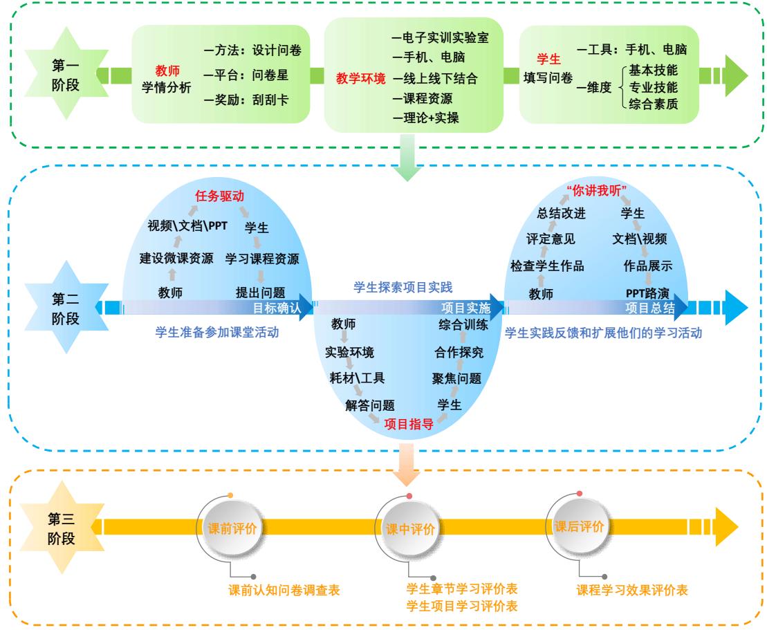第一阶段是教师确定教学环境,对学生进行一个学情分析,通过问卷星设计问卷,对学生的基本技能、专业技能和综合素质做一个初步的了解。