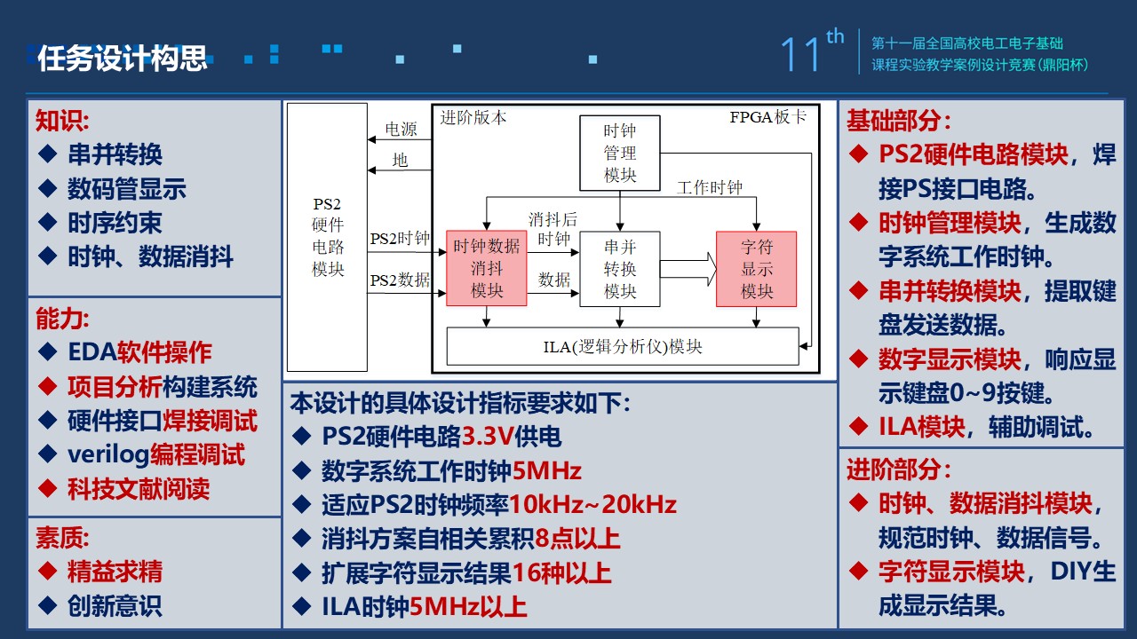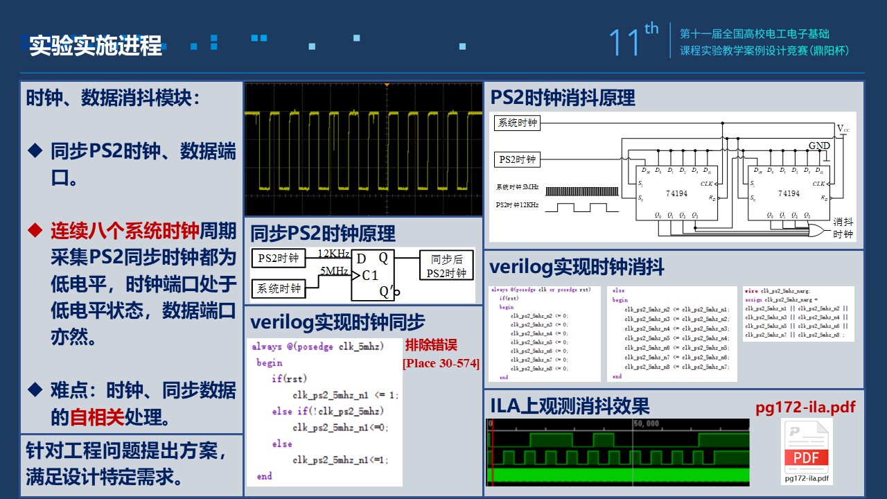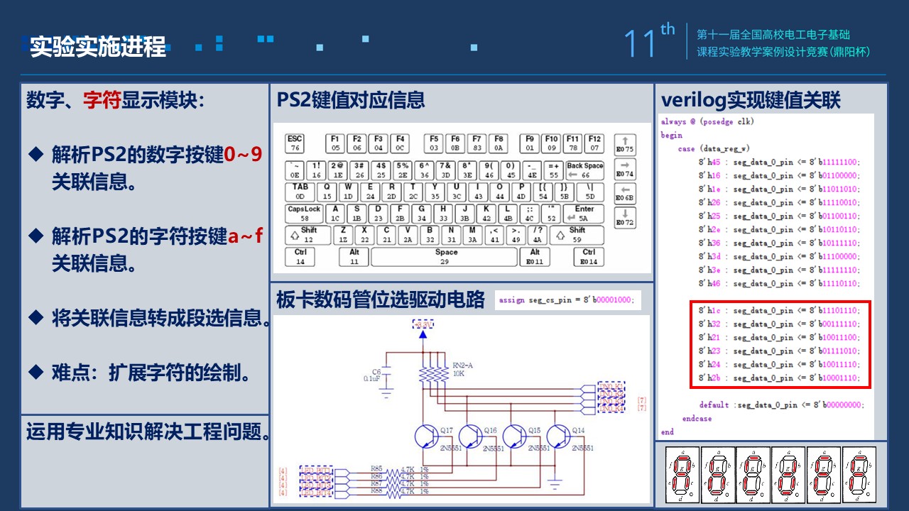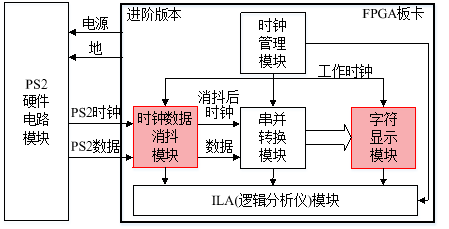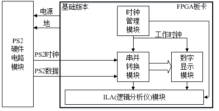 1)数字电路的实验是设计性的,学生课前完成设计,学习PS2通信协议,了解键盘电气特性和工作时序。