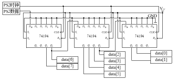 PS2协议和UART通信协议非常相似,键盘按照这个协议发送数据,FPGA作为主机,只需要正确的实现该协议的解码,将其中的8位数据位读取出来即可。由上图可知,数据在时钟的下降沿处是稳定的,因此只需要捕获时钟信号的下降沿,并在检测到这个下降沿时去读取数据线上的电平,就能够正确的读到数据。在PS2协议中,包含了从机到主机和主机到从机的通信时序,只是在进行PS2键盘的解码时,可以不需要进行主机到从机的通信。引导同学利用理论课上学习的双向移位寄存器74194完成以上逻辑模型设计,再用硬件描述语言完成程序编写。