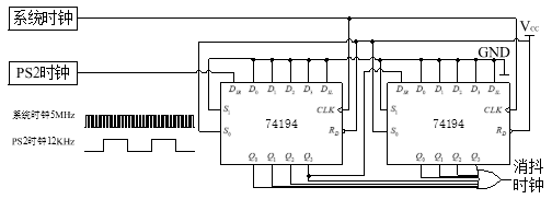 同步时钟消抖模块,利用频率较高的系统时钟扫描频率较低的PS2同步时钟。连续八个系统时钟周期采集PS2同步时钟都为低电平,才认为PS2时钟端口处于低电平状态,同理可判断PS2数据端口的低电平状态。