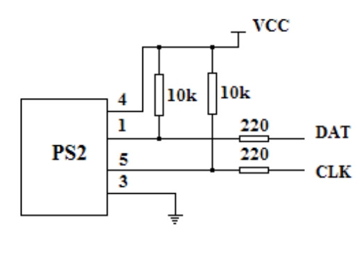 PS2键盘靠PC的PS2端口提供+5V电源,由于Clock和DATA两个脚都是集电极开路的,则必须接上拉电阻。 主从设备之间的数据通信采用双向同步方式传输,时钟信号由PC产生。它们平时一般保持高电平,有输出时才会被拉到低电平,之后会自动上浮到高电平。(即置“0”就把线拉低,置“1”就把线上浮成高电平)。