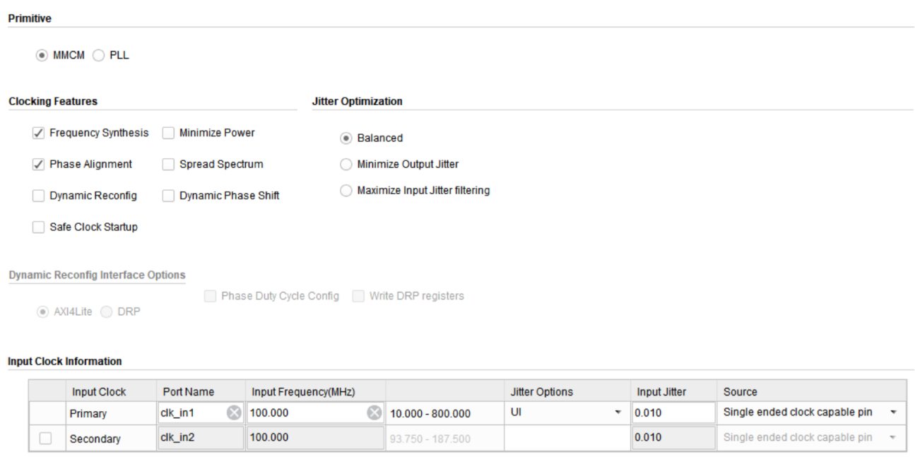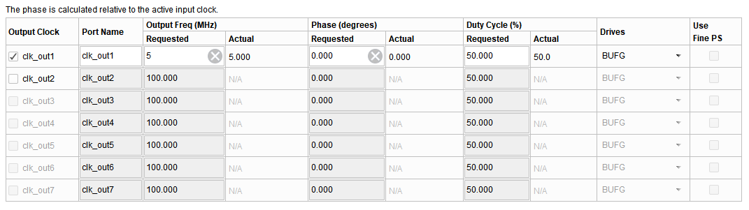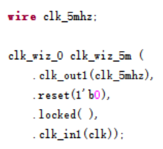 将FPGA板上100MHz输入时钟,转化为5MHz单端时钟,作为软件程序的系统时钟。时钟管理器配置方式、调用代码如下图所示。