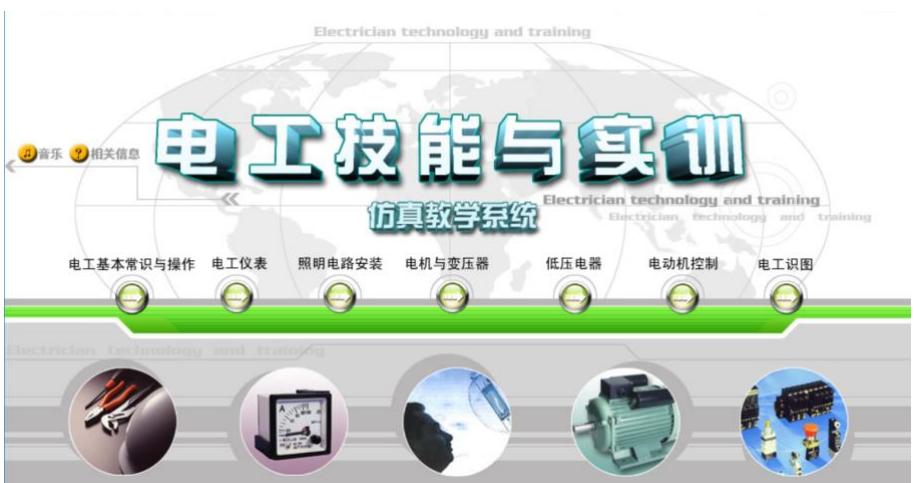 3)虚拟仿真软件包含电工基本常识与操作注意事项、电工仪表使用、照明电路安装训练、电机与变压器分类及原理、低压电器(分类、结构及原理)、电动机控制电路建模与仿真、电工识图等模块组成,主界面如图 4。