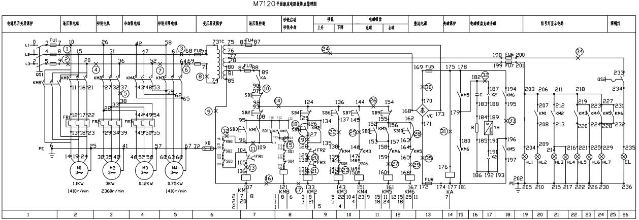 液压泵控制电路完成对液压泵电机(M1)的连动控制,砂轮上升/下降控制电路对砂轮升降电机(M4)形成正/反转点动控制,砂轮启动/停止控制电路对砂轮电机及冷却泵电机(M2、M3)形成连动控制。