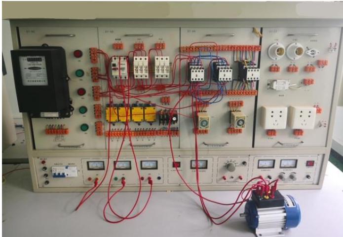 学生根据指导教师给出的特定参数,利用断路器、熔断器、交流接触器、按钮开关、热继电器及三相异步电动机等器件设计并搭建相关电路,并开机运行验证技术指标,教师现场打分。