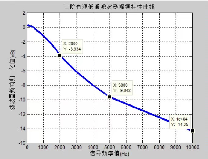 选择模拟滤波器方案,需确定滤波器阶数,然后根据有源低通滤波器的指标要求,选择合适的元器件按技术指标(截止频率2 kHz)设计电路并形成所需频响特性;