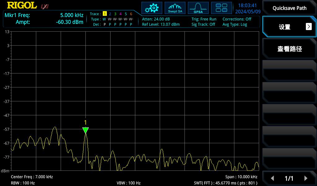 基于搭建好的综合化实验平台,接入加噪音频,通过播放器感受滤波前后音乐,并通过频谱分析仪观看滤波前后信号频谱。滤波前后的频谱图如附图12、附图13所示。