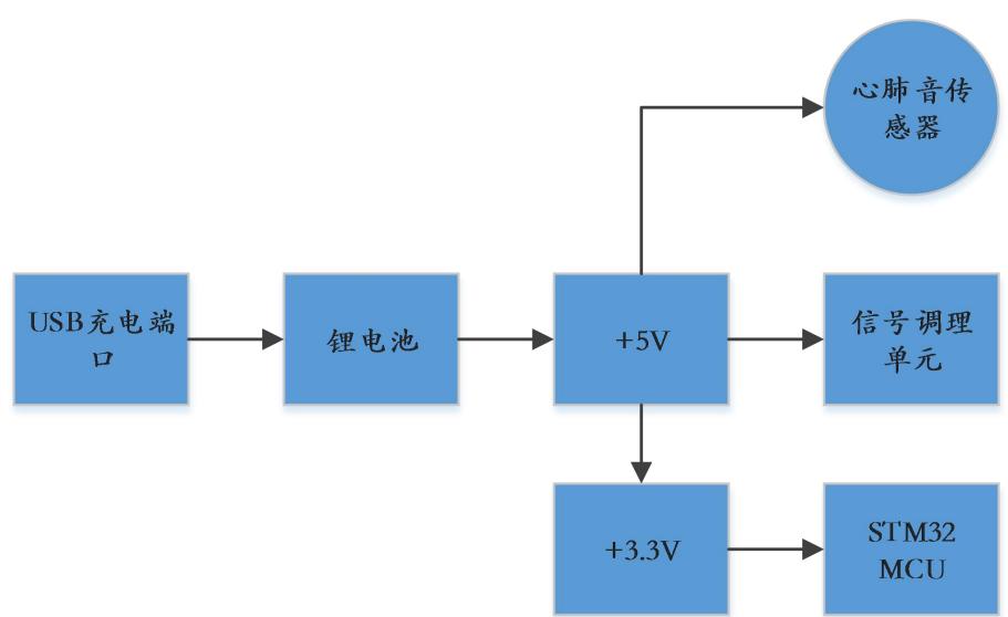实验项目为便携式蓝牙电子听诊器,系统工作电源主要有MCU工作的 $+ 3 . 3 \lor$ 、信号调理单元和传感器工作需要的 $+ 5 \mathsf { V }$ 电源。主电源由锂电池提供,需要设计锂电池的充电电路,锂电池升压电路和降压电路,系统电源管理方案如图 2所示,参考器件有 TP4057、PS7516、LM1117。