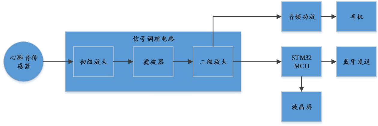 系统结构如图 1 所示,传感器所采集的心肺音信号经过信号调理电路后,一路由音频功放驱动耳机发出心肺音,一路经STM32的ADC 进行模数转换,由 STM32 处理后在液晶屏上显示波形和数值,并将采集的数据通过蓝牙发送给上位机,可进行进一步处理。