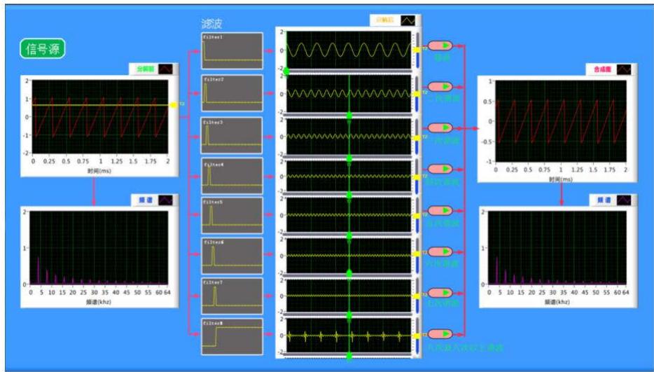1)布置课外实验,利用虚拟仪器,完成三角波、半波、全波、锯齿波各类型信号的分解;