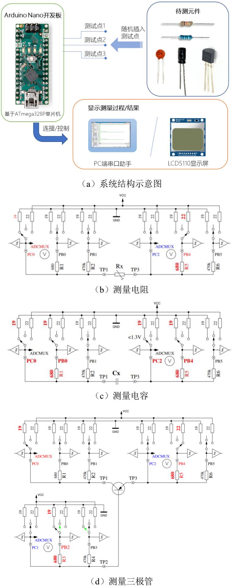 结合开源资料,利用 ATmega328P 单片机设计制作一个简易的二端元件和三端元件智能识别和参数测量系统,将待测元件随机插入测量点,系统输出元件的类型和参数值。系统结构示意图和核心测量电路如图 1 所示。