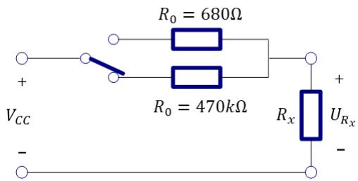 所以???? = $\begin{array} { r } { R _ { x } = \frac { U _ { R _ { x } } R _ { 0 } } { V _ { C C } - U _ { R _ { x } } } } \end{array}$ ????????0 ,已知电阻??0有两种情况:较小的 680Ω 和较大的 470kΩ。