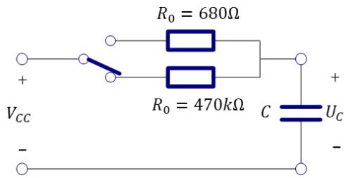 其中电阻 $R _ { 0 }$ 有两种情况:较小的 $6 8 0 \Omega$ 和较大的 $4 7 0 \mathrm { k } \Omega$ 。