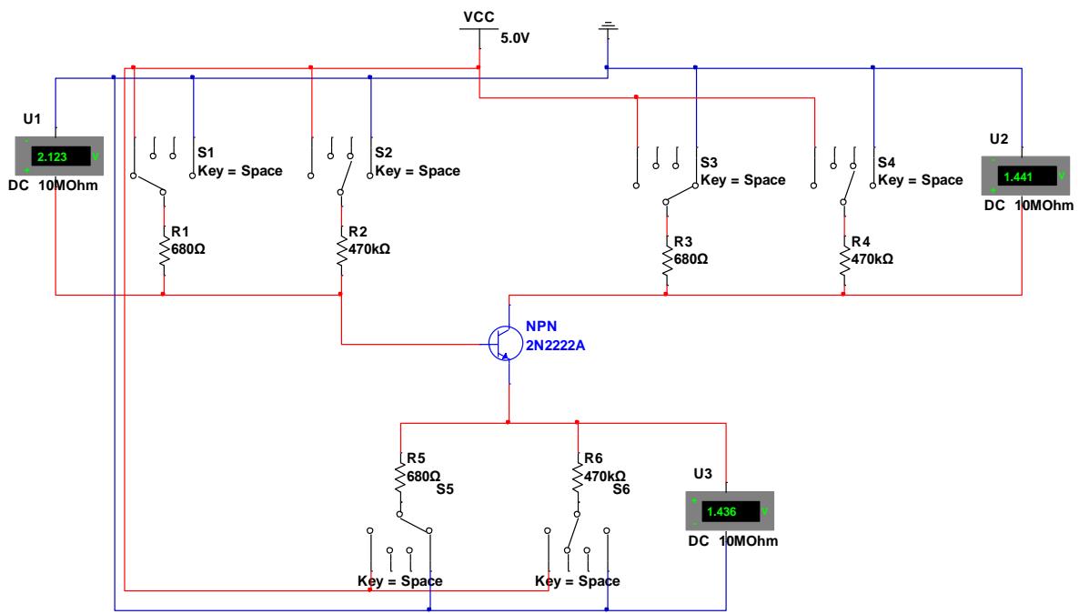 以下实验方案可供参考,在探索三极管导通或关断及放大的不同电路设计时,可以借助Multisim 电路仿真。