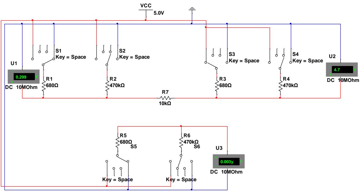 通过预测量的方式划分待测电阻的大小区间,再转入合适的档位进行阻值测量。例如,先在输入端选用 $R _ { 0 } = 6 8 0 \Omega$ ,若测得 $U _ { R _ { x } } > U _ { T h r e s }$ ,说明待测电阻值较大,换用 $R _ { 0 } = 4 7 0 k \Omega$ 。基于 Multisim 进行电阻测量仿真的电路如图 2 所示。