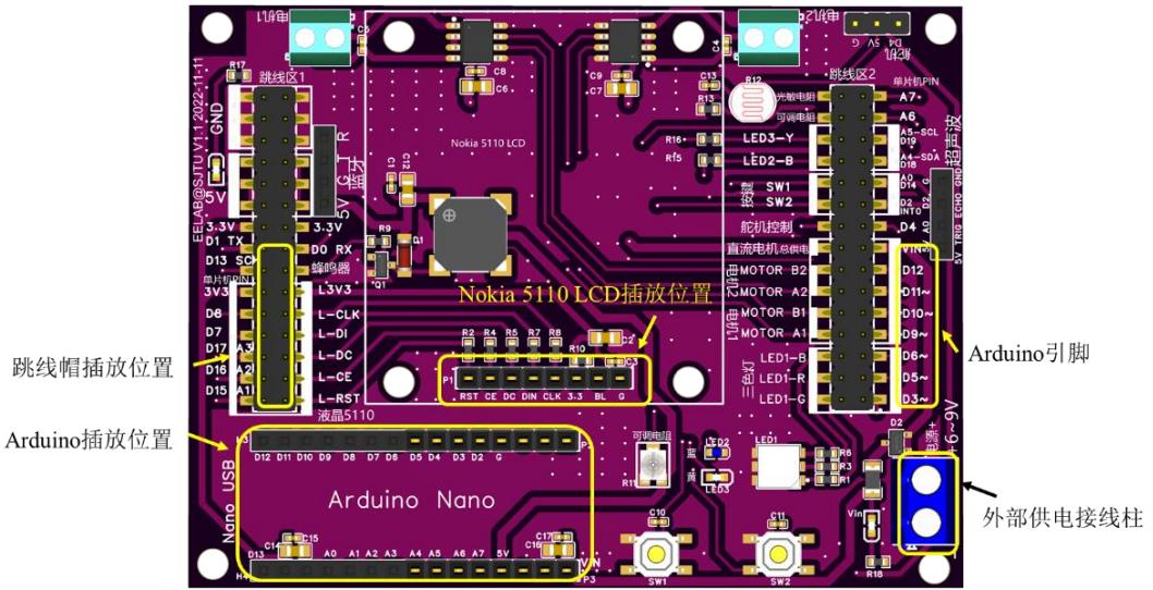 为便于 Arduino Nano 开发控制应用,如图 12 所示,课程组自制底板并编写相关使用手册供学生参考。该底板设置了供电引脚、Arduino Nano 的放置区域、Nokia 5110 LCD 显示屏放置区域等,可以通过跳线方便的将 Arduino 引脚直接与外设相连。当不连接跳线时,Arduino引脚可以连接板外的其他外设。