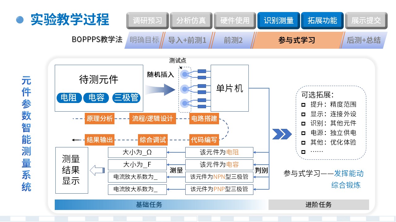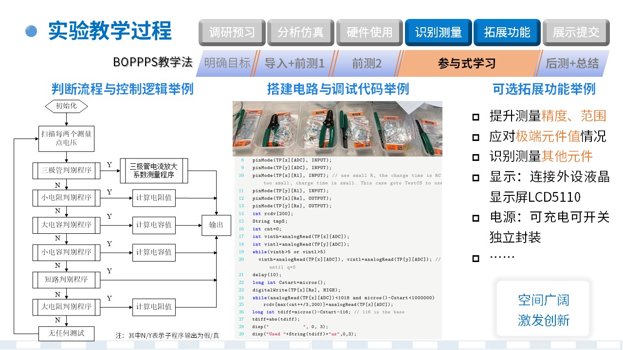 | 参与式学习Participatory learning | 以学生自主组内合作完成为主,教师随时答疑为辅① 识别元件类型和测量元件参数② 测量结果的显示和其他拓展功能 | 课内2学时课外3学时 | |