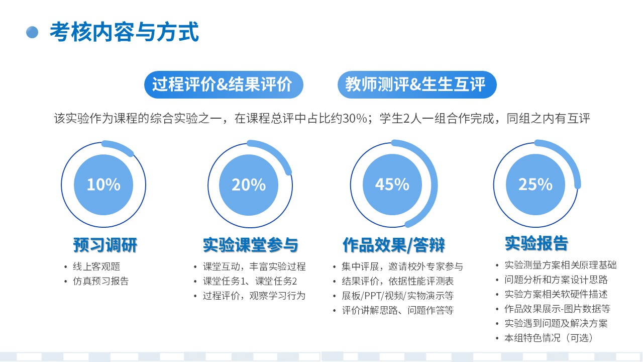 每个教学节段(调研预习、课堂实验、组内合作、作品汇报、成果提交)对学生的学习行为观察及教学过程的实施,有助于师生互动和信息沟通,把握学生实验进展。有过程评价和结果评价,让更多的学生有学习获得感,提升实验课程学习体验。