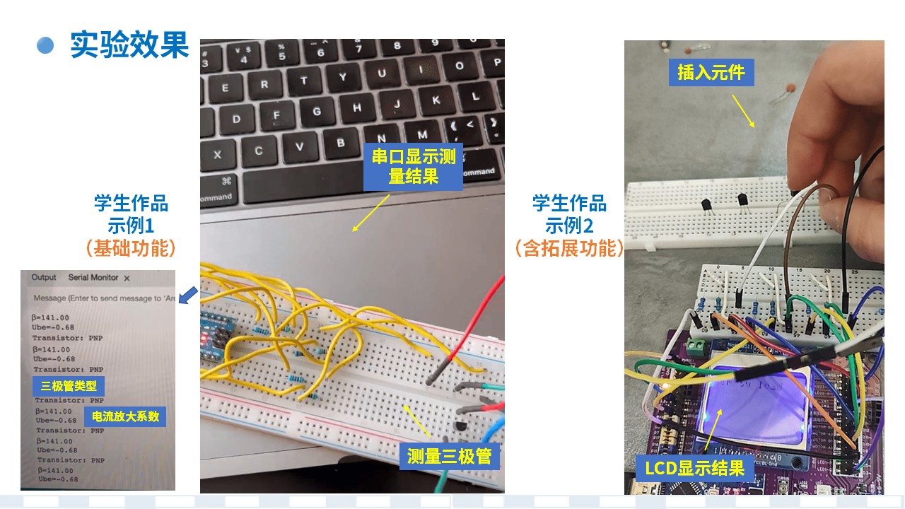 a. 元件类型识别和参数测量:采用面包板或万用板搭建测试电路,能自动识别两端元件的类型和元件参数值,如电阻/电容;能自动识别三极管的类型(NPN/PNP)和电流放大倍数