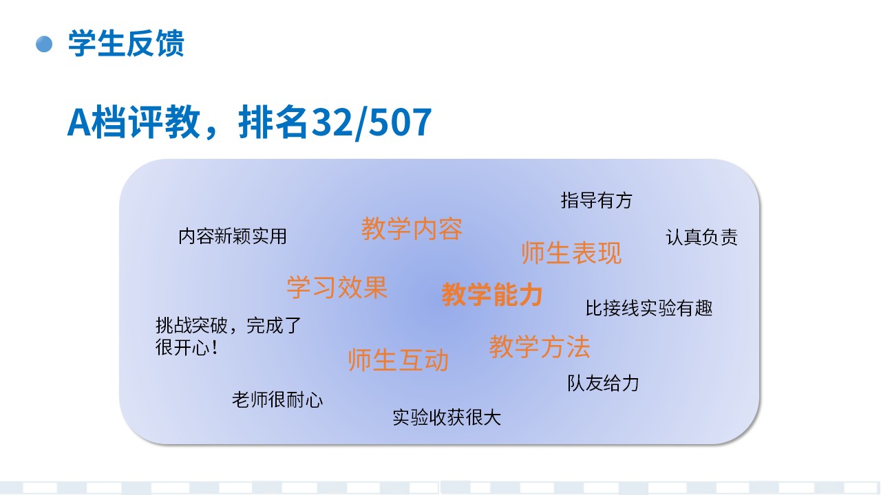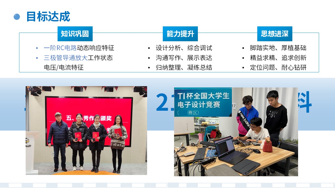 a. 实践类课程实验中遇到非预期的输出是常见且宝贵的学习机会,实验是环环相扣的复杂系列过程,分析问题、定位问题、解决问题的过程不仅有助于巩固理论知识、积累工程经验,更能培养耐心钻研、勇于克服困难的品性和解决实际问题的综合能力。b. 本实验项目的电路设计和底层判据是基于基础原理知识,复杂综合的电路系统的根基是对最基本原理的熟悉和灵活应用,脚踏实地打好基础尤为重要。c. 本实验项目内容可扩展进深,且设置集体作品展示和答辩,对优异性能指标或有拓展附加功能作品予以奖励,鼓励学生追求精益求精和创新。