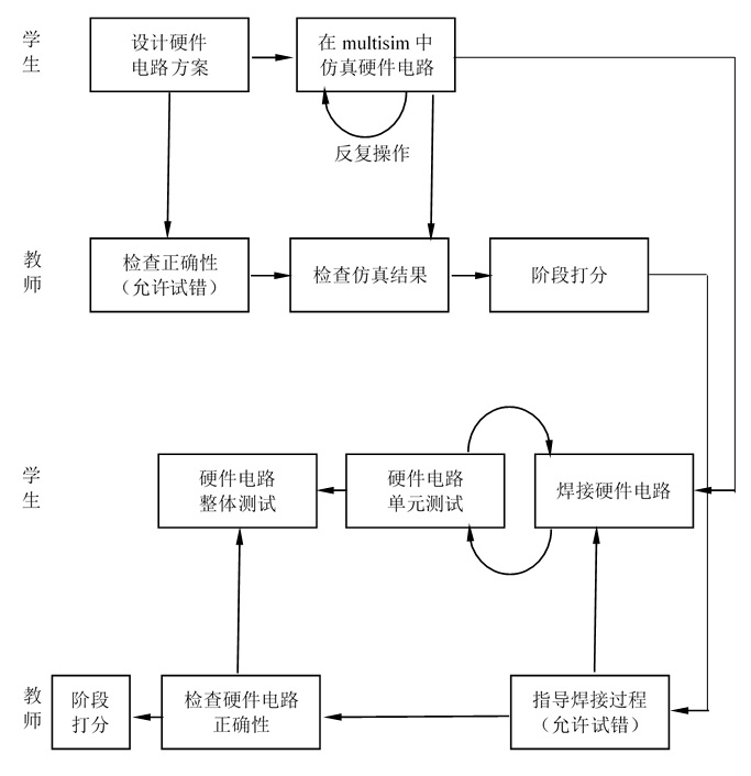 本实验项目面对的是大学一年级的新生,是一个前导性的内容。学生基本没有电路实验的经验,因此实验项目的目的并不在于实现的难度、复杂度等,而是让学生经历完整的实验设计、电路搭建、电路调试测试、结果分析总结等步骤,培养学生基本实验思维、系统概念、仪器使用、团队协作等能力。在实验教学中,应在以下几个方面加强对学生的引导: