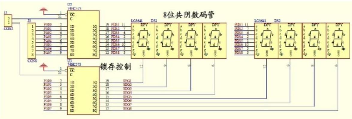 iv) 数码管显示电路可选用共阴极 8 位数码管,LED 显示发光二极管的阴极连接在一起,并公共接地,当发光二极管的阳极设置为高电平时,发光二极管被点亮,相应的段被显示。同时,与数码管相连的锁存器把当前的状态锁存起来,使单片机送出的数据在接口电路的输出端保持一段时间锁存后状态不再发生变化,直到解除锁定。电路当中 74hc573 就是锁存器,锁存引脚高电平表示直通状态,为低电平表示锁存状态,可以通过控制锁存引脚,控制 74hc573 后端输出数据。