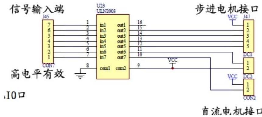 ii)直流电机与单片机之间的连接电路如下图所示,J45 端与单片机 IO 口相连接,信号经过 ULN2003 芯片后,驱动电机进行动作,ULN2003 芯片具备适用电压范围宽、驱动电流大的特点。实验中在单片机内进行直流电机的转动方向,转动速度的控制。