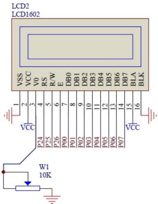 i)本实验液晶显示部分使用 LCD1602 器件,该器件与单片机之间进行数据通信和控制输出,电路连接图如下所示,其主要管脚定义见表1。
