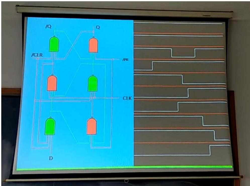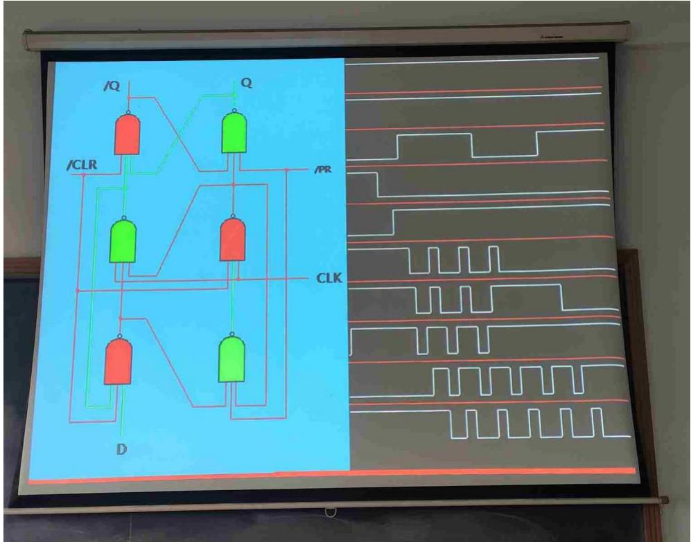 (1)带领学生通过 PPT 回顾课堂教学内容,分析 D 触发器的 12 号门为/S-/R 锁存器,1234 号门组成带使能的SR锁存器,不考虑 abc三条反馈线,123456号门组成了D锁存器。