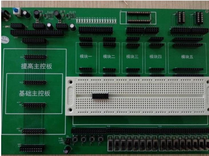 (4)让学生自行在实验箱的面包板上搭建D触发器测试电路,但不能上电。可使用实验箱,方便按键、灯、电源都通过连接实验箱上的插座实现。如果没有实验箱,可以自行在面包板上搭建完整电路。