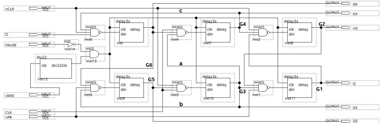 (13)让学生打开 Quartus Prime 软件,打开/lab/dff_delay 工程,打开 dff_delay.bdf。并讲解电路图。对照课堂上的 D 触发器模型电路图,学生会发现是在 6 个与非门的 D 触发器基础上增加了两种电路结构 div22 和 delay3s。为了便于学生观察,电路将每个与非门的输出经过 delay3s模块输出来观察。