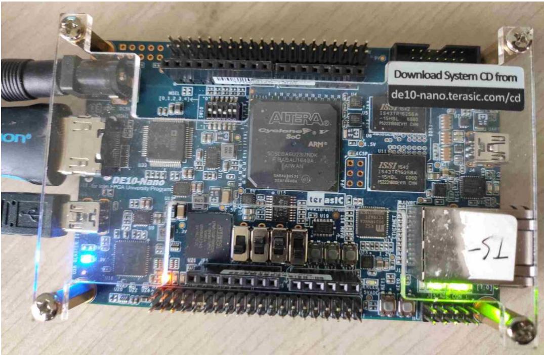 (19)让学生按图示连接 DE10_NANO 开发板,将 HDMI 输出接到电视或经过 HDMI 转 VGA 转换器接到显示器上。