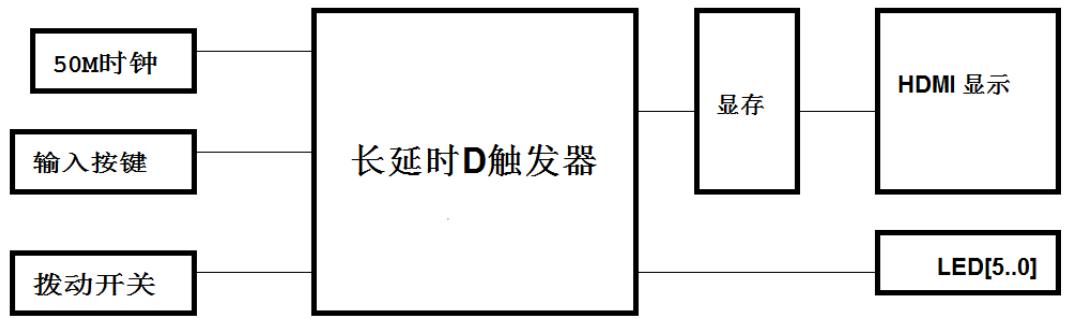 工程的内核为“缓动D触发器模型”,将输入时钟接 DE10_NANO的 50M主时钟,其他输入接按键和开关。D触发器每个与非门原本的 6个输出为G1~G6,将这些输出送入一个约 1.7秒的延时电路,该延时电路能将用户 0.084秒以上的按键或开关输入变化都经过每个与非门 1.7秒的延时输出出来,从而通过模拟的人眼可见的与非门逻辑变化,观察 D 触发器的内部工作过程。“缓动 D 触发器模型”输出 6 个门的逻辑状态和内部延时信息。屏幕显示由一个带初始化文件的显存构成,为了兼容VGA显示,屏幕分辨率设定为 $6 4 0 ^ { * } 4 8 0$ 。初始化文件画出了整个屏幕的背景和固定的字符等。6 个门的逻辑状态和内部延时信息用于刷新显存,使屏幕呈现出动画效果。为了兼容于非DE10_NANO的开发板,可以拆掉显存,直接使用LED[5..0]进行输出显示,但不如动画效果直观清楚。