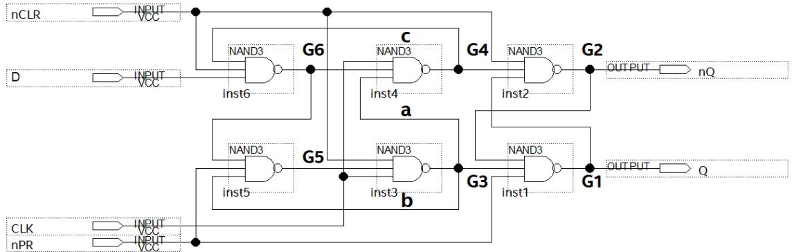 3)基于 DE10_NANO,通过按键和开关改变输入信号 D、CLK、nCLR、nPR 的逻辑电平,在显示器或者电视上对照左侧的图形变化和右侧波形的同步变化,测试和研究 D 触发器的逻辑功能,记录次态真值表并记录内部输入输出电平变化及先后关系。