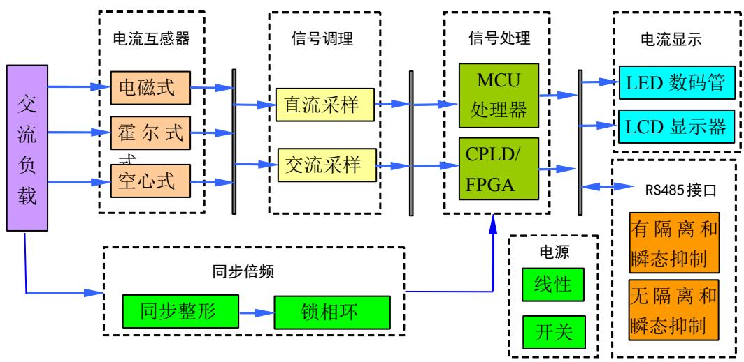变频交流电源过流保护系统一般实现方案如图 2 所示, 系统的 电流互感器、 信号调理、 处理器、电流显示、 电源和通讯接 口 的具体实现方式均具有多样性的特点。 系统各主要环节的具体实现方案如下: