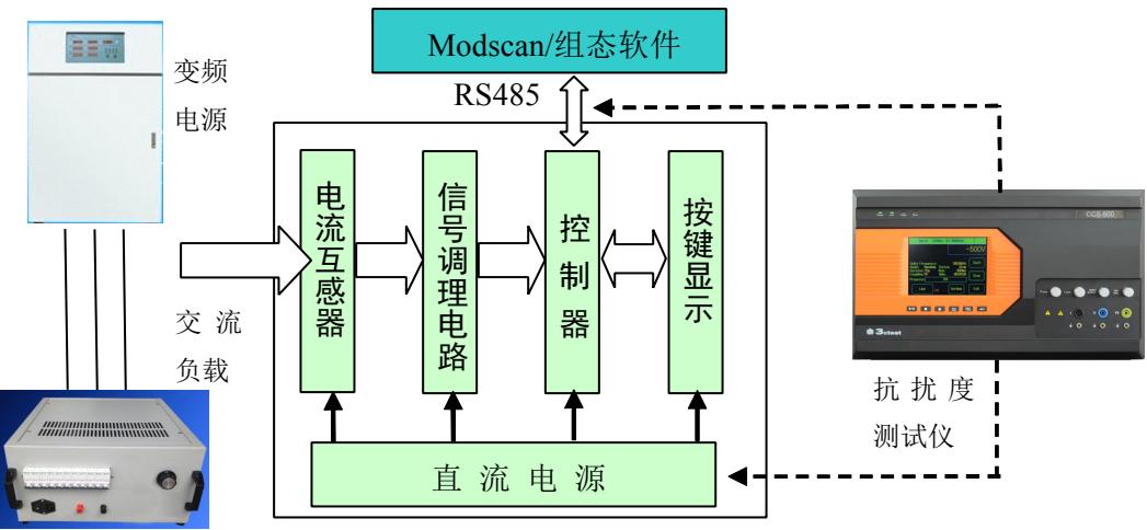 过流保护系统总体结构如图 1 所示 一般包括直流电源 微控制器 电流互感器与信号调理电路、 人机接 口和通讯接 口 。 直流电源为系统个模块和芯片提供稳定可靠的直流电源; 电流互感器和信号调理电路实现被测 电流信号的采集、 滤波和变换; 控制器主要完成信号采样、 计算、 显示、 保护和通讯; 按键和显示模块构成系统的人机接 口 , 用于参数、 状态显示和参数设置。 实验中 的被测交流电流可由实验室的变频电源和交流可调负载提供; 电脑中预装 Modscan调试软件或组态软件 可对 Modbus 通讯功能进行测试; 抗扰度测试仪用于对系统的采样通道和通讯接 口施加干扰信号, 测试系统的抗干扰能力 。
