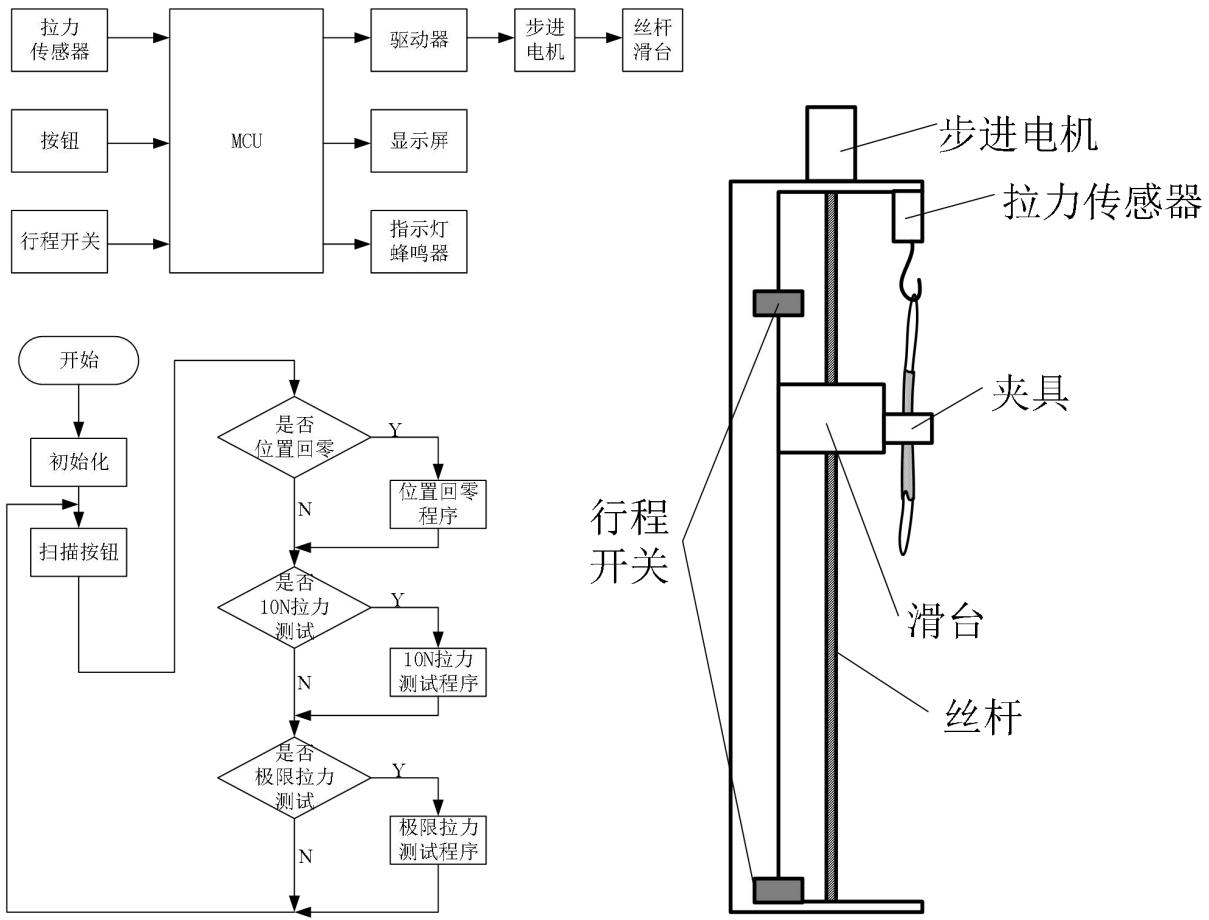 图 1 方案框图(上)、程序流程图(下)、结构示意图(右)